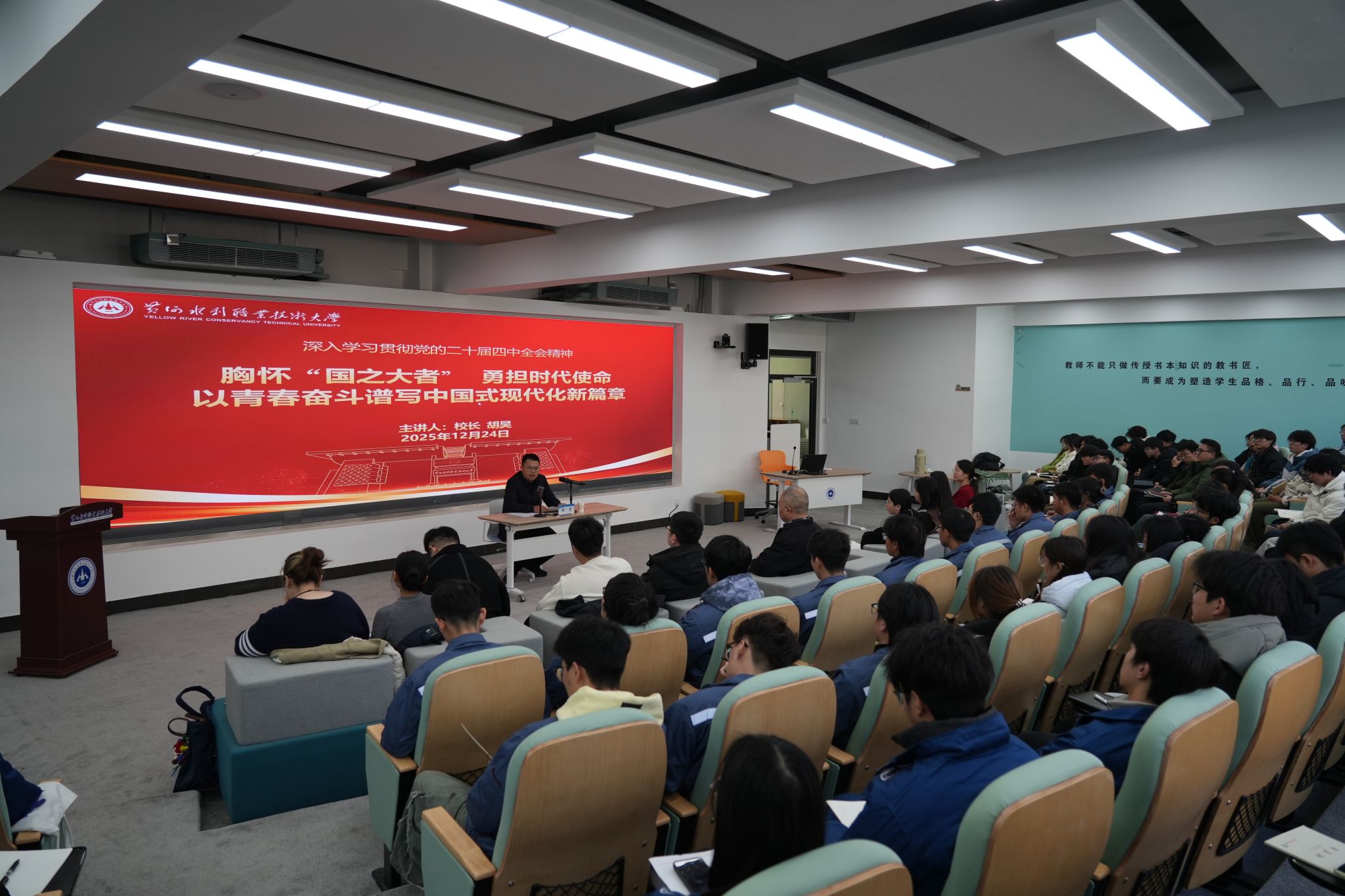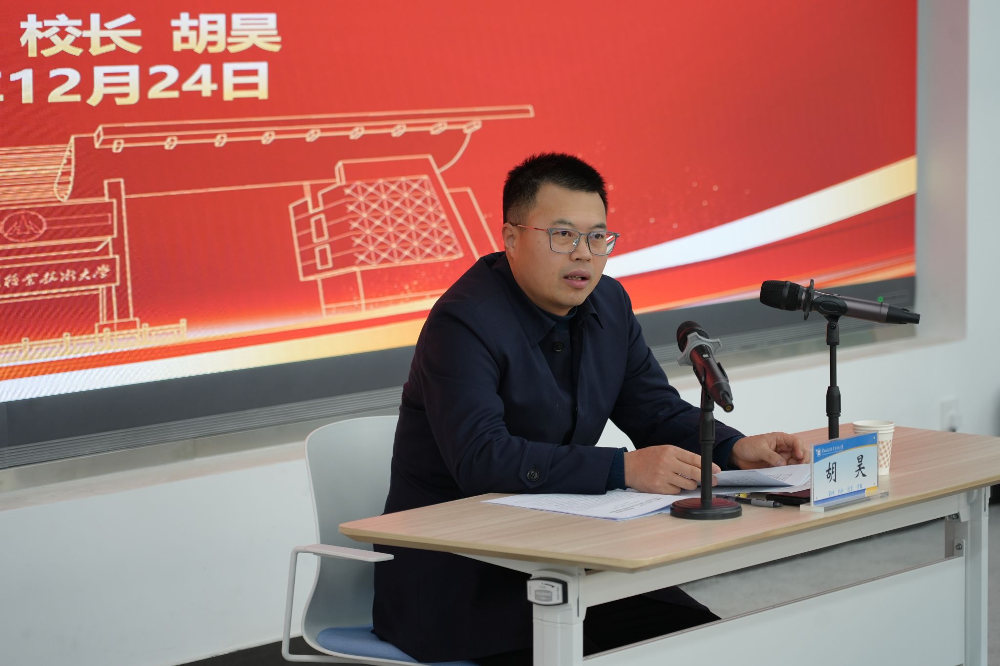 12月24日,我校在7号实训馆7502举行学习贯彻党的二十届四中全会精神宣讲会,学校党的二十届四中全会精神宣讲团团长、校长胡昊以《胸怀“国之大者” 勇担时代使命——以青春奋斗谱写中国式现代化新篇章》为题,为师生作宣讲报告。青年教师代表、学生代表共100余人现场聆听报告。报告会由宣讲团副团长、党委副书记杨士恒主持。