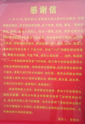 11月15日,我市一名87岁老人外出散步,因找不到回家的路,加之劳累、饥饿、着急,摔倒在路边。此时,我院水资源工程系2012级学生甄红光、柳洞刚、黄玉富、赵永辉等4名同学经过,急忙将老人搀扶进我院校园,一边让老人休息,一边陪老人聊天,并积极帮老人回忆家人信息。在4人的不断努力下,最终联系到了老人女儿,并将老人安全送到家中。4名学生谢绝了老人家人的回报,继续返回学校正常上课。