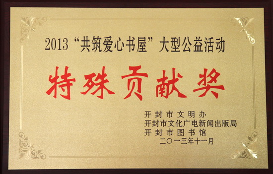 11月15日,由开封市文明办、开封市文化广电新闻出版局等主办的2013年“共筑爱心书屋”大型公益活动表彰颁奖仪式在开封市图书馆隆重举行。仪式上共表彰“特殊贡献奖”4个、“十佳爱心”单位10个、“优秀组织”奖10个,我院荣获“特殊贡献奖”称号。