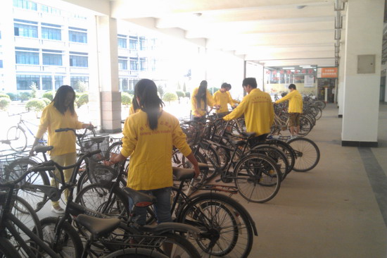 院社团联合部志愿者整理校园内凌乱堆放的自行车
