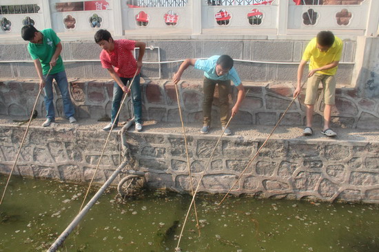 院学生会组织学生清理校门外水池里的垃圾