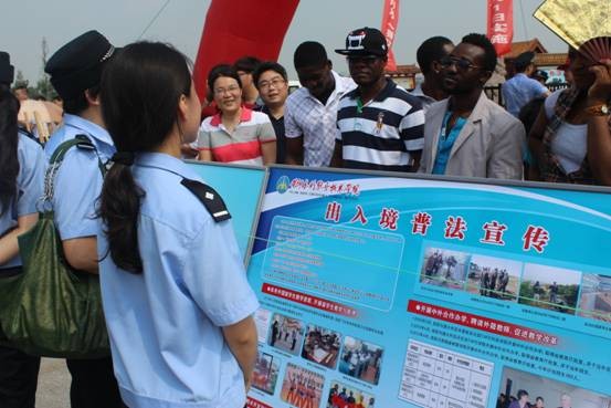 《中华人民共和国出境入境管理法》于2013年7月1日正式实施,为使我院非洲留学生更好的了解、运用新法,切实营造新法贯彻实施的良好氛围,7月1日上午,在开封市公安局出入境管理支队的统一协调下,我院部分非洲留学生在水利系副书记陶永霞和专业教师雷恒、曹明伟的组织下在午朝门广场参加了法律宣传活动。