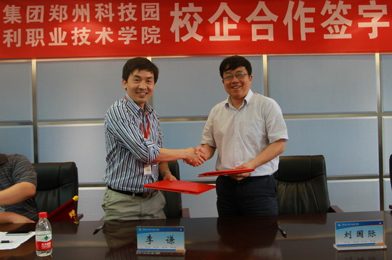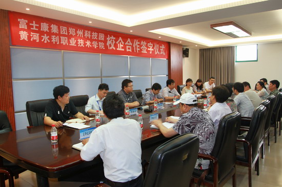 5月24日上午,我院与富士康集团郑州科技工业园校企合作签约仪式在行政楼第二会议室举行。富士康集团郑州科技工业园专理李谦、曾启洋等一行5人,我院院长刘国际、副院长刘紫婷,招生就业服务中心主任李纪宾、副主任商坤,机电系、自动化系、信息工程系、环化系、管理系、外语系等相关系部负责人参加签约仪式。