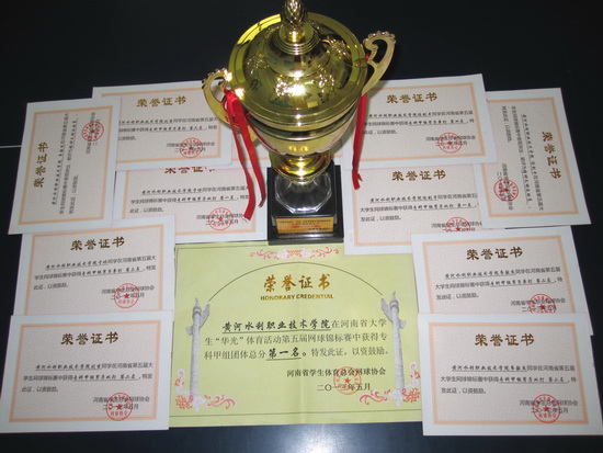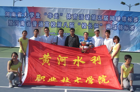 5月6日至10日,由省教育厅主办的河南省大学生“华光”体育活动第五届网球锦标赛在河南大学举行,我院网球队在体育部主任刘盎(领队)和教练员张亚廷、蔡寄平的带领下参加比赛,取得专科甲组团体第一名,包揽了专科甲组男子双打冠军(于冰/陈剑平)、亚军(刘玄/韦毅杰)和男子单打亚军(韦毅杰)、第三名(于冰)、第四名(陈剑平)和第六名(刘玄),女子单打也打入本科甲组16强(赵倩倩),创造了我院省级体育竞赛 “团体第一名”的零突破。