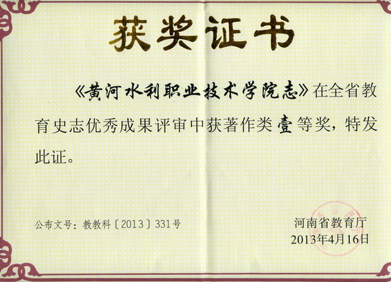 日前,河南省教育厅下发《河南省教育厅关于表彰全省教育史志优秀成果的通知》(教教科〔2013〕331号),《黄河水利职业技术学院志》荣获著作类一等奖。此次评审共评出全省优秀教育史志优秀成果73项,其中著作类62项(一等奖11部作品)、论文类11项。
