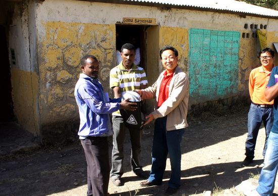 为此,援建埃塞风电项目测量队代表学院购置了足球、纸笔等文体用品,到测区内的Tede小学进行捐赠。周建郑教授将文体用品赠送给Tede小学Abebe Eshetu校长,并希望学生们要努力学习,争取早日成材。Abebe Eshetu校长也表达了谢意,祝愿中埃友谊长存。