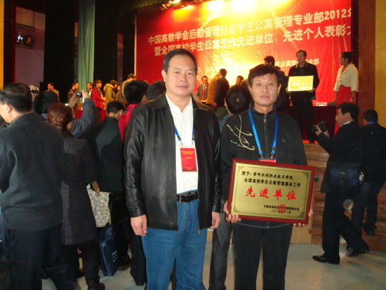 11月24日,中国高等教育学会后勤管理分会学生公寓管理专业部2012年年会暨全国高校学生公寓工作先进单位、先进个人表彰大会在贵阳召开。我院在会上荣获“全国高校学生公寓管理服务工作先进单位”荣誉称号,河南省有12家高校获此殊荣,我院是高职高专院校中唯一获奖单位。另外,学生公寓服务中心经理郭祥田荣获“全国高校学生公寓管理服务先进个人”称号。教育部发展规划司高校后勤改革处朱宝铜处长和中国高等教育学会后勤管理分会领导为先进集体和先进个人颁发了奖牌证书。