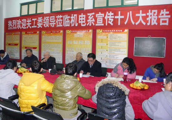 下午,由我院关工委和机电工程系共同举办的学习宣传贯彻党的十八大精神座谈会在机电系党员活动室召开,我院关工委秘书长姚阜新以及离退休干部来作华、白济民、郑乃明老师来到机电系与学生热烈座谈,机电系党总支副书记胡晓慧以及部分学生参加了此次座谈会。