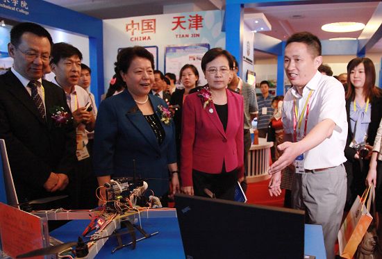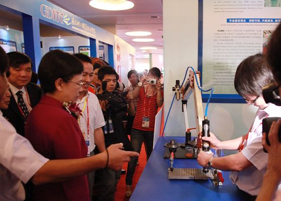 9月21日上午,在广西南宁2012中国-东盟职业教育联展暨论坛现场,教育部副部长鲁昕在广西壮族自治区副主席李康和自治区教育厅厅长高枫等陪同下,率教育部、广西自治区等教育部门领导与东盟各国教育部门官员一起查看了我院参加2012中国-东盟职教联展暨论坛的展位。我院参展团队逐一演示了参展作品,回答了鲁昕副部长等提出的有关学生制作作品过程、性能、企业行业应用、获取专利等情况,赢得鲁昕副部长等教育部门领导的称赞和肯定,展位前人员熙攘,现场气氛热烈。