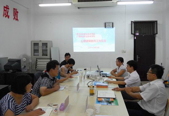 刘许亮副处长向客人介绍了学院的基本情况。倪凤琨结合PPT就我院三级心理保健网络建设、心理健康教育活动的开展、心理普测及建档、心理危机干预、专兼职人员待遇等情况向来宾做了详细介绍,并与客人进行了深入探讨,我院的心理社团建设、趣味心理运动会和心理班会等心理健康教育活动受到来宾的称赞。随后,王国英副处长和霍卫红老师就辅导员的待遇和职称评定问题与李柳红副处长进行了深入交流。李柳红副处长对黄河水利职业技术学院的热情接待表示衷心感谢,希望能不断地加强两校之间的交流合作。