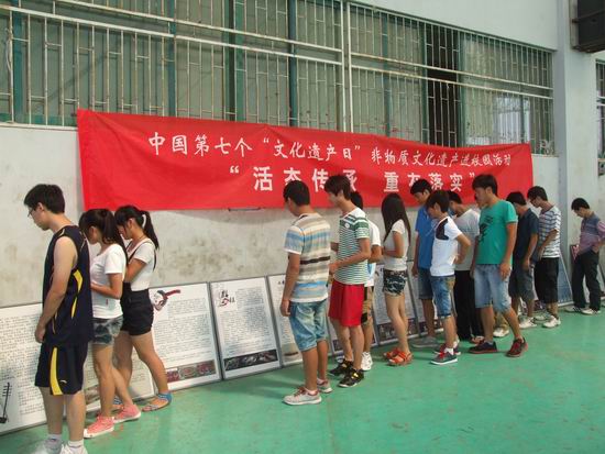 为迎接我国第七个“文化遗产日”,大力弘扬中华民族优秀传统文化,6月9日上午,开封市非物质文化遗产保护中心在我院风雨球场举办了一场非物质文化遗产展示宣传活动。