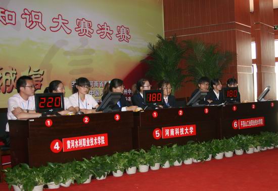 本次决赛共有来自全省各高校的36个代表队,我院组成了以单润涛为领队,胡引生、单润涛两人为指导教师,环化系食品1001班付军伟、管理系电子商务1101班王敏、王喜喜、水利系水工1007班赵连珍为队员的参赛队。5月16日,队员们按时报到后,就积极的联系承办单位到比赛场地熟悉抢答器,对各个抢答器的特点做到心中有数。5月17日赛前,胡引生老师对4名队员进行了赛前的指导,分析了比赛场上可能遇到的各类情况制定了相应对策,决定由付军伟、王敏、王喜喜3名同学参加本场比赛。