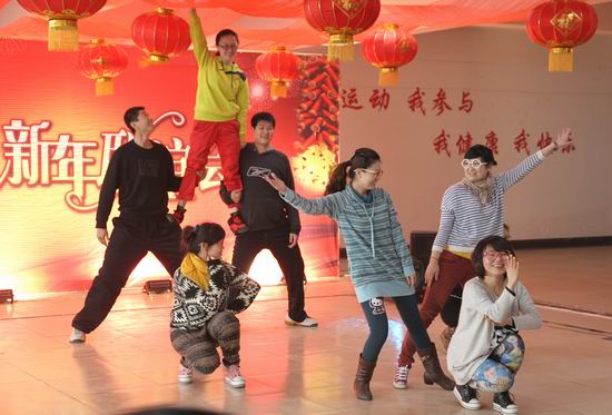 一曲集体舞《我们一起开心吧》拉开了联谊会的序幕。随后,教师们精心准备的歌舞节目精彩纷呈:4位来自不同系别的青年教师表演的三句半《锣鼓叮咚夸学院》幽默诙谐、动感十足;土木系、财经系教职工表演了温馨的歌曲《相亲相爱一家人》和《读你》,表达了教师亲如一家的深厚友谊。院领导身着唐装,集体朗诵了诗歌《中华民族的脊梁》,以饱含深情的言语表达了对党的赞颂和对祖国的一片挚爱之情。随后,机电系教师带来的搏击操《眉飞色舞》展现了青年教师的风采;刘紫婷副院长深情放歌《绒花》;王卫东副书记和院学工系统代表共同表演了歌舞《自由飞翔》。节目中还适时穿插了一个个互动性很强的游戏,充分调动起了观众的热情,大家踊跃参与,现场气氛活跃。一曲曲悦耳的旋律,一声声动情的吟唱,一支支优美的舞蹈,将联谊会推向了一个又一个高潮。