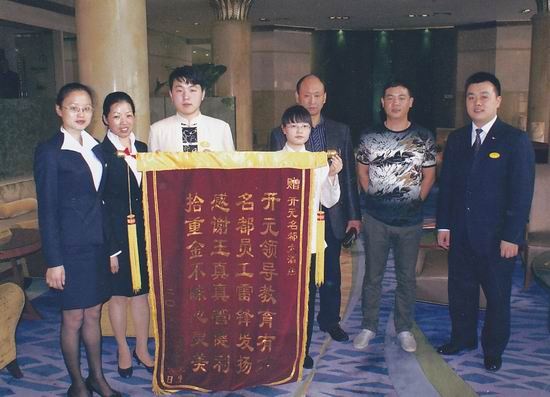手包的主人朱先生是来汴进行商贸洽谈投资的湖北籍商人,失而复得的他心中充满了感动与感激,随即向酒店赠送了这面锦旗,以表达对酒店,尤其是对拾金不昧的我院学子管健利同学的感谢与表扬。锦旗之上,管健利同学被赞“拾金不昧心灵美”。上学期在中州国际饭店实习时,管健利同学就曾在客房拾到一块欧米茄名表,也毫不犹豫地通过努力找到并交给失主。管健利同学拾金不昧的行为,不仅为酒店,更是为黄河水院赢得了良好的美誉度,也为维护开封良好形象、优化投资环境做出了自己应有的贡献。