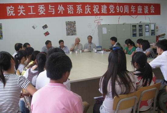 为庆祝中国共产党建党90周年,进一步提高外语系师生的思想政治觉悟,应外语系直属党支部的邀请,6月21日下午,我院关工委黄新、白济民、郑乃明、来作华、葛长雄、刘玉宗等离退休老领导、老教师与外语系师生同聚一堂,回顾党的历史,缅怀党的先驱,歌颂党的伟大功绩。参加座谈会的还有院离退休工作处书记陈广先、外语系主任王爱琴、书记樊建科、分团委书记王成伟等。