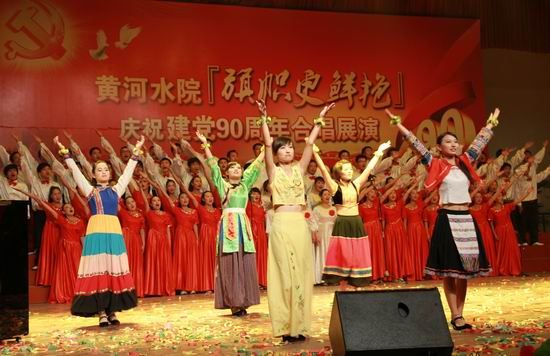 党旗飘扬、歌声嘹亮。在锣鼓喧天、激情澎湃的热烈气氛中,院党委书记张惠贞首先致辞。张书记指出,90年峥嵘岁月,伟大的中国共产党领导勤劳、勇敢、智慧的中国人民实现了民族独立、人民解放和国家富强、人民幸福。特别是改革开放的30年,更是取得了举世瞩目的辉煌成就,创造了一个个人间奇迹。伴随党的兴旺和祖国的发展,学院也走过了82年的发展历程。特别是步入新世纪的10年,沐浴着国家大力发展职业教育的春风,学院实现了大发展、大跨越:新校区拔地而起,人才培养水平评估获得优秀,国家示范性高职院校建设取得成功,学院顺利步入全国高等职业教育前列。学院的每一次发展、每一个进步、每一点成绩都来自于各级党组织的坚强有力,来自于全院师生员工的共同努力,来自于全体党员的无私奉献。红色经典歌曲是我党90年光辉历程的生动写照,我院师生以“旗帜更鲜艳”为主题,用红歌迎接党的90华诞,以赞曲讴歌伟大的祖国、伟大的党,既别开生面,也很有意义。要以此来营造喜庆、祥和、团结奋进的浓厚氛围,来聚集人气、凝聚人心、激发热情、提振精神,继承革命传统、发扬优良作风,为党的教育事业、为中华民族的伟大复兴贡献智慧和力量,为黄河水院谱写更加辉煌的篇章。