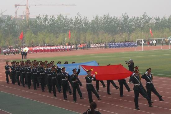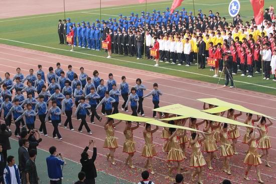 上午8点30分,伴随着激昂的运动员进行曲,国旗护卫队和彩旗队首先入场,他们以飒爽的英姿守护着鲜艳的五星红旗,迈着整齐矫健的步伐,喊着铿锵有力的口号,精神饱满的从主席台前走过,拉开了此次大会的帷幕。随后,全院14个系部代表队迈着整齐有序的步伐相继入场。他们身着整齐的服装,踏着欢快的军乐,展现着各系独有的活力与特色,充分彰显了我院学子昂扬的精神风貌。环化系方阵打出了“绿色、环保、健康、和谐”等口号,既展现了系办学特点,也倡导了环保健康的人文观念;土木系的地球莲花模型,突出了独特的建筑风格;测绘系的女子方阵身着女式迷彩军装,英姿飒爽,表现着巾帼不让须眉的昂扬士气;财经系和管理系方阵以一群直飞云天的白鸽,赢得了现场观众的阵阵欢呼;信息工程系方阵将网络游戏中的动漫人物带到了现实,充分展示了动漫游戏专业的特色;旅游系、艺术系方队色彩缤纷的着装则给人以亮丽清新的感觉。