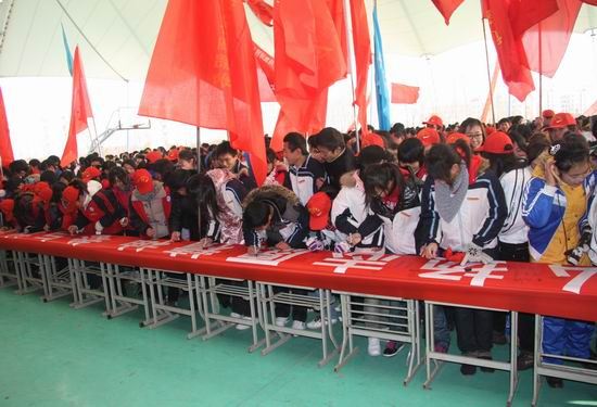 启动仪式结束后,各位领导和志愿者共同在“弘扬志愿精神、参与地震救援、共建和谐社会”条幅上签名。广大青年志愿者和同学们纷纷表示,愿意积极投身于地震救援等志愿者服务中来。
