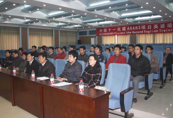 11月29日上午,中国十一化建公司ASAB3项目工程人员英语培训班开班仪式在我院多功能报告厅举行。十一化建公司李书记、杜总工程师和张主任,我院外语系直属党支部书记樊建科、副主任王爱琴、院科研外事处处长张春满、副处长陈琳等参加了开班仪式。