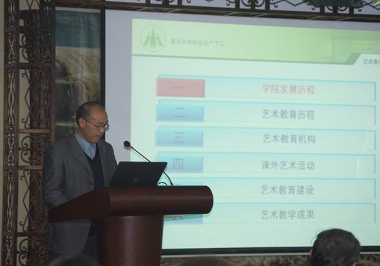 会上,刘国际院长代表学院对省高校艺术工作评估专家组的到来表示热烈的欢迎和衷心的感谢。艺术教育评估专家组长巩伟在会上讲话,指出公共艺术教育在高校中的重要地位。他说,专家组受省教育厅的委托对黄河水利职业技术学院艺术教育工作进行评估,将严格按照教育部关于高校艺术教育的各类文件和指标体系检查该校艺术教育各项工作是否规范和完善。随后,艺术系副主任宗致远就我院近年来的公共艺术教育工作做了整体汇报,并向专家展示了学院发展历史、学院艺术教育发展过程、艺术教育机构设置、课外艺术活动、艺术教育建设、艺术教育成果等内容。