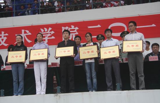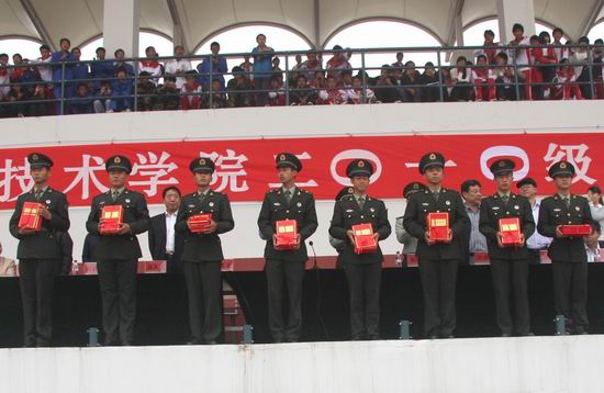 军训分列式结束后,学生处处长菅浩然宣布了军训总评获奖方队(系部)、十佳教官、优秀辅导员和学生助理名单。院领导和部队首长向获奖单位和个人颁发了奖牌和证书。