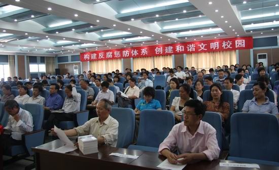大会由副院长孙五继主持,党委副书记、纪委书记王卫东首先传达了黄河水院党委《关于印发< 黄河水利职业技术学院开展反腐倡廉警示教育活动实施方案>的通知》的文件精神。《方案》共分指导思想、目的和成效、基本原则、教育对象、方法步骤、组织领导6个部分内容。王书记强调警示教育活动要遵循学习和整改相结合、排查和自纠相结合、警示教育和解决问题相结合、重点和整体相结合四个基本原则。按照学习提高、自查自纠、整改建制、总结督察四个阶段来进行,活动时间安排为40天。
