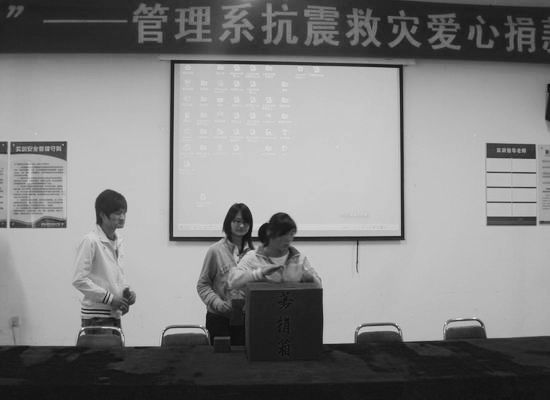 4月20日,管理系党总支积极响应院党委的号召,发动全系师生踊跃向地震灾区捐款献爱心。该系很多同学自发地以班级为单位,将他们的爱心捐款投进了募捐箱。春潮涌动,爱心成河,在场的每一位师生都为奉献爱心而感到暖意融融。截至发稿时,全系已捐款8800余元。