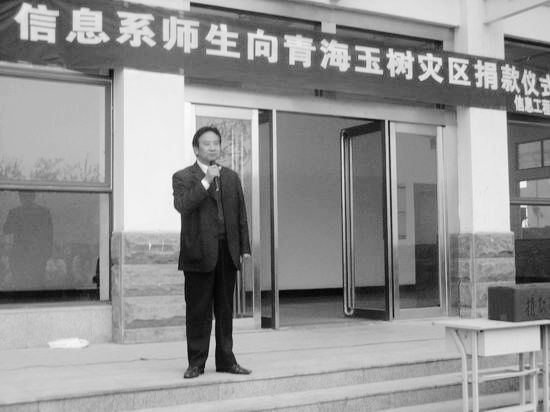 捐款仪式上,信息系党总支书记何聚坤说,4月14日,青海玉树县发生7.1级强震,灾区同胞蒙受巨大的生命和财产损失,灾区同胞的生活生存正面临严峻挑战。何书记号召全系老师和同学们发扬中华民族“一方有难,八方支援”的传统美德,伸出关爱之手,献出仁爱之心,帮助灾区同胞共渡难关,为灾区重建做出一份贡献。