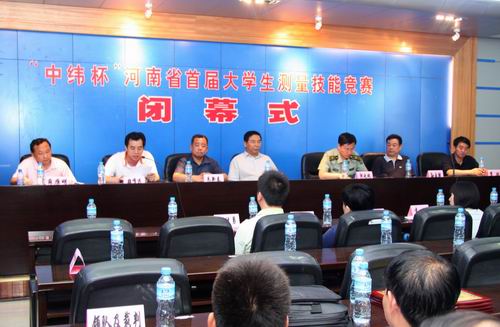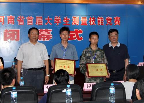 闭幕式上,河南省测绘局副局长禄丰年宣布了此次比赛的团体获奖名单:黄河水利职业技术学院、解放军测绘学院代表队获得团体一等奖。我院孙五继副院长宣布了“黄河水文杯”水准测量分项竞赛获奖名单:黄河水利职业技术学院、解放军测绘学院代表队获得水准测量技能一等奖,河南城建学院等7支代表队获得二、三等奖。省测绘学会秘书长朱新春宣布了“众望测绘杯”导线测量分项竞赛获奖名单:黄河水利职业技术学院、解放军测绘学院代表队获得导线测量技能一等奖,河南理工大学等7支代表队获得二、三等奖。省测绘学会测绘教委会主任委员郭延斌宣布了“天拓科技杯”数字测图分项竞赛获奖名单:黄河水利职业技术学院、河南城建学院代表队获得数字测图技能一等奖,解放军测绘学院等7支代表队获得二、三等奖。郑州测绘学校教务处长薛雁明宣布我院获得优秀组织奖。