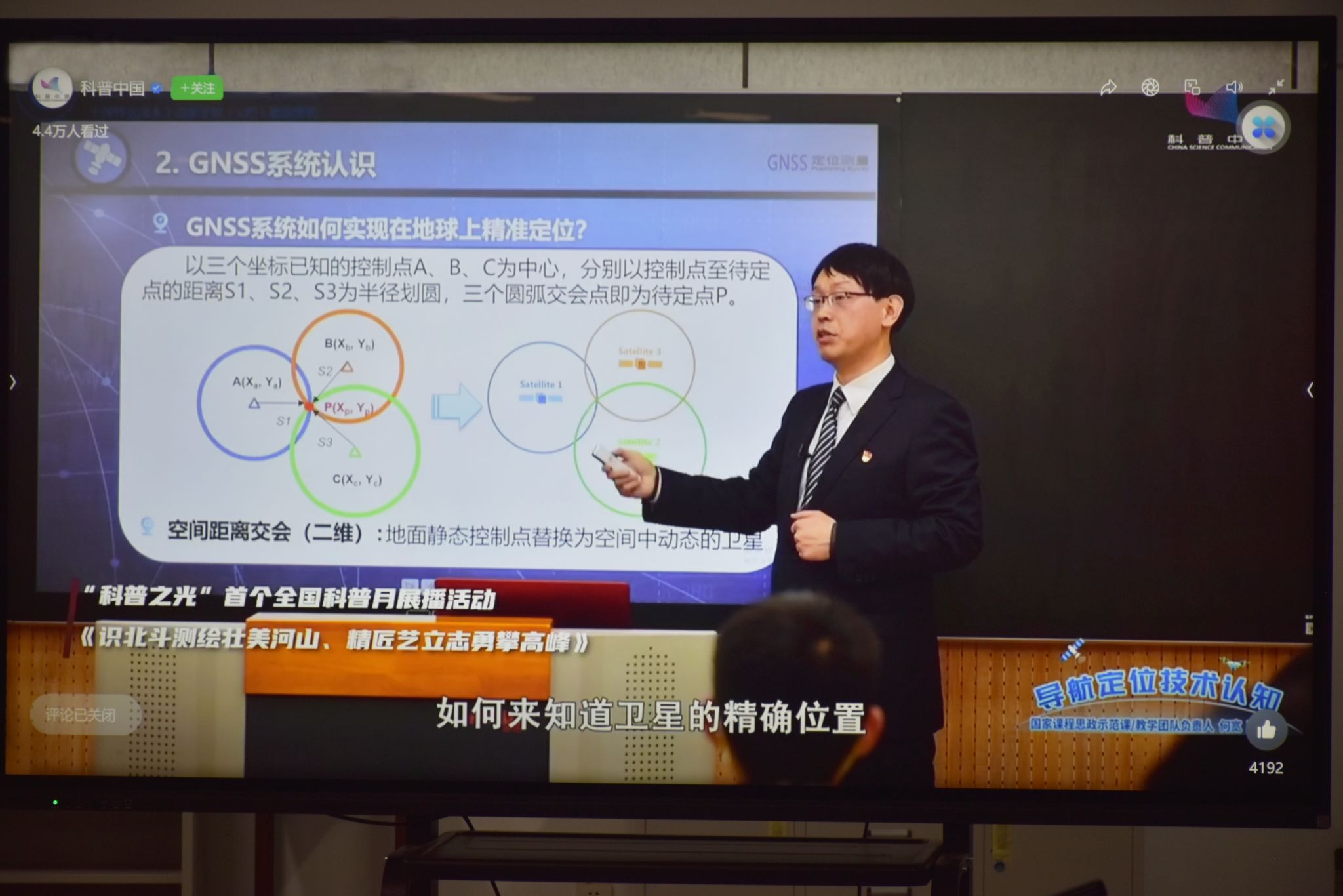 在这场覆盖全国的科普盛会上,494949最快历史结果app测绘工程学院受邀在“悦科普”板块重磅登场。学院何宽院长与党争老师联袂呈现的“识北斗测绘壮美山河,精匠艺立志勇攀高峰”专题汇报,实现全网同步传播,让学院在卫星导航领域的专业实力与育人理念,通过国家级平台触达全国观众,吸引行业内外广泛关注,成为学院对外展示“工匠精神”培育成果、服务国家战略实践的重要载体,大幅提升学院行业影响力与社会知名度。