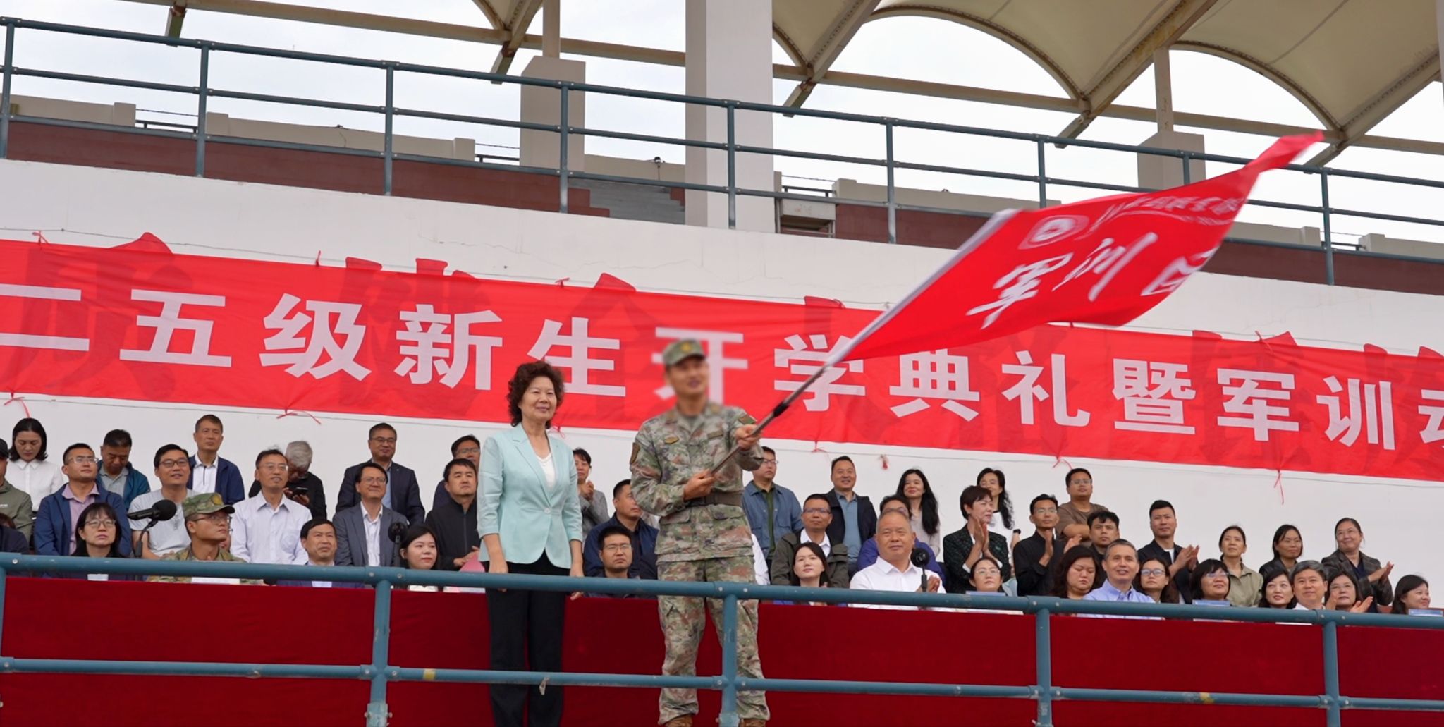 戎装飒飒,军旗猎猎。校党委书记周保平向军训团授团旗,标志着我校2025级新生军事训练工作正式拉开帷幕。
