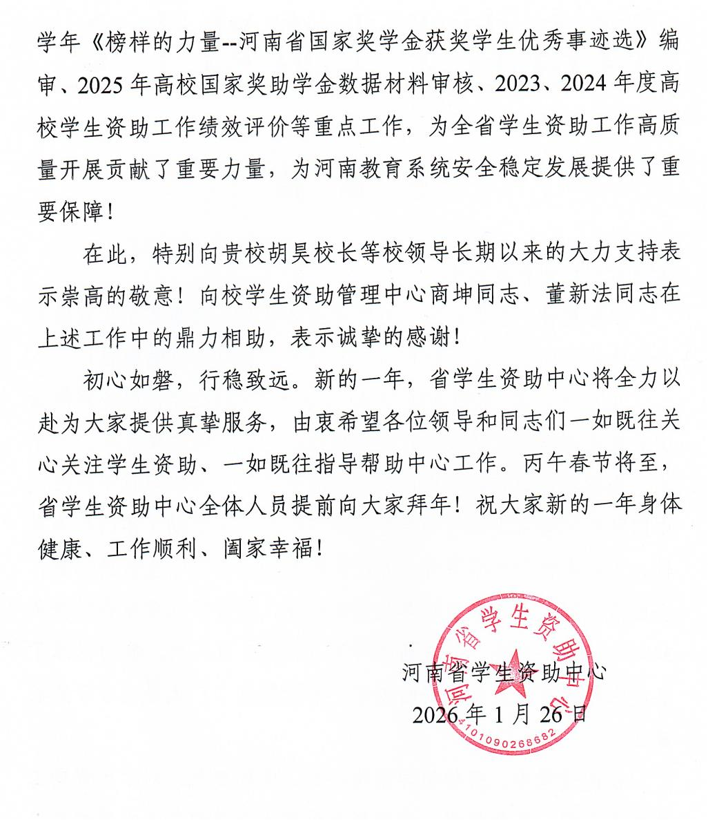 近日,河南省学生资助中心向我校发来感谢信。信中,省资助中心高度肯定了学校在推动全省学生资助工作高质量发展中的突出贡献,并对学校在政策落实、精准资助、育人成效及重点工作参与等方面的出色表现予以表扬!