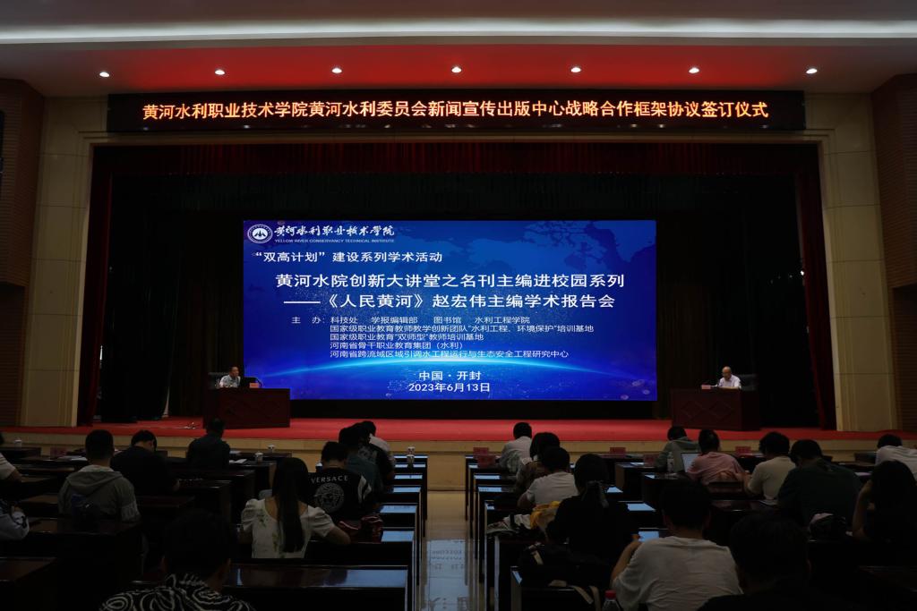 6月13日上午,《人民黄河》杂志社社长、执行主编赵宏伟教授应邀来我校作《科技论文写作与发表》学术报告。学校党委副书记、校长胡昊,党委副书记、工会主席杨士恒出席报告会,党委宣传部、科技处、学报编辑部、水利工程学院负责人和学校师生代表100余人现场聆听报告。国家级职业教育教师教学创新团队培训基地(水利工程、环境保护)、国家级职业教育“双师型”教师培训基地(水利类)、河南省骨干职业教育集团(水利)和河南省跨流域区域引调水运行与生态安全工程研究中心成员单位骨干教师200余人线上学习。报告会由党委宣传部部长彭新立主持。