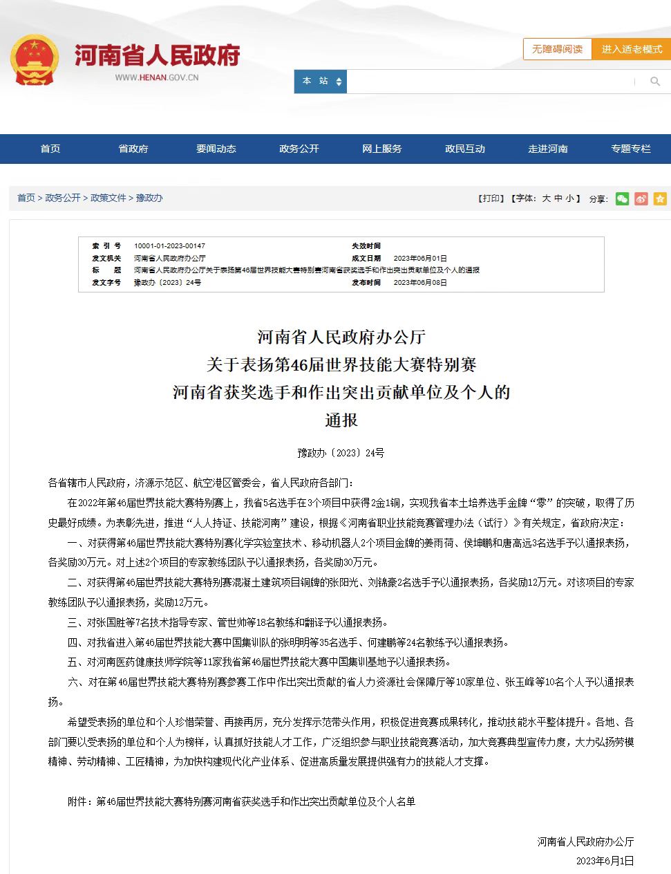 近日,河南省人民政府办公厅发布了《关于表扬第46届世界技能大赛特别赛河南省获奖选手和作出突出贡献单位及个人的通报》我校张延教授位列其中。