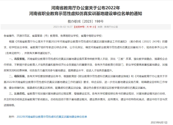 近日,省教育厅印发了《河南省教育厅办公室关于开展2022年河南省职业教育示范性虚拟仿真实训基地建设工作的通知》(教办职成〔2022〕243号)。我校环境工程学院“生态环境虚拟仿真实训基地”项目以第一名入选2022年河南省职业教育示范性虚拟仿真实训基地建设项目。