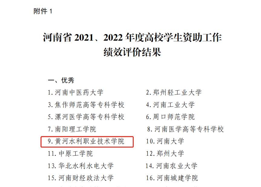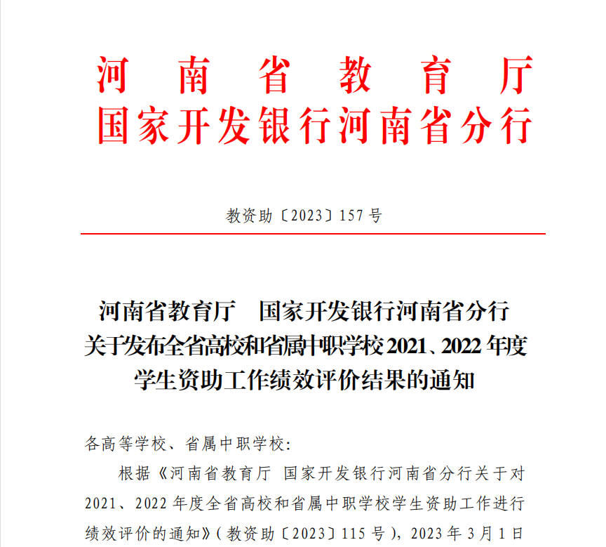 近日,河南省教育厅会同国家开发银行河南省分行对全省高校和省属中职学校2021、2022年度学生资助工作进行了全面绩效评价。本次绩效评价分为学校自评、专家组复评和实地复核三个阶段,考核内容包括基础保障、日常管理、管理绩效和附加评价等。在对155所高校的绩效评价中,共有37所高校获评“优秀”等级,我校位列其中。