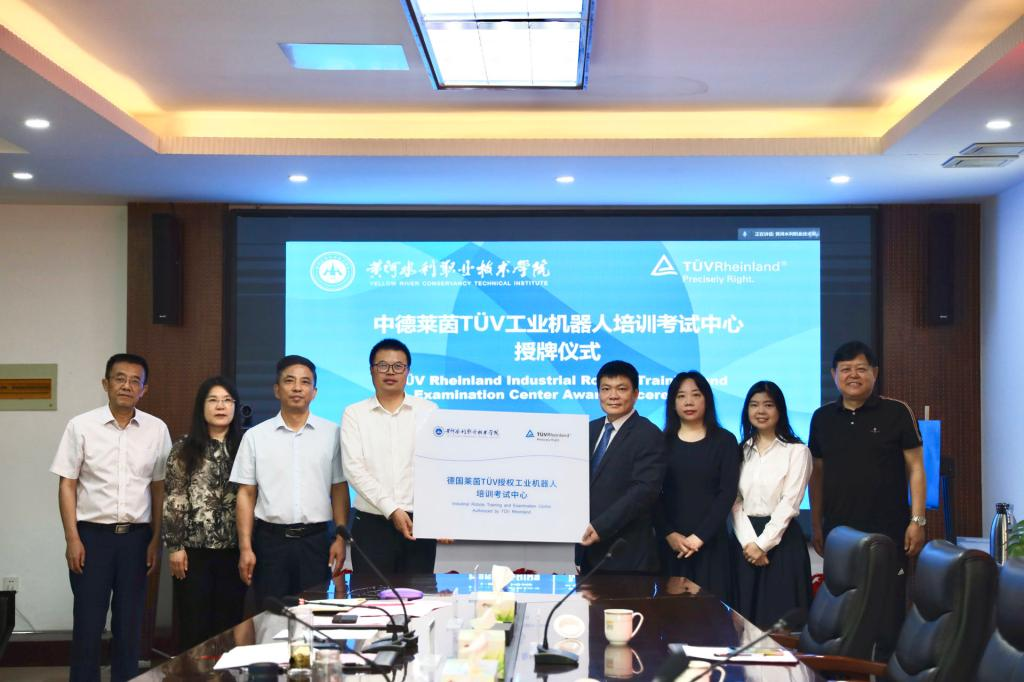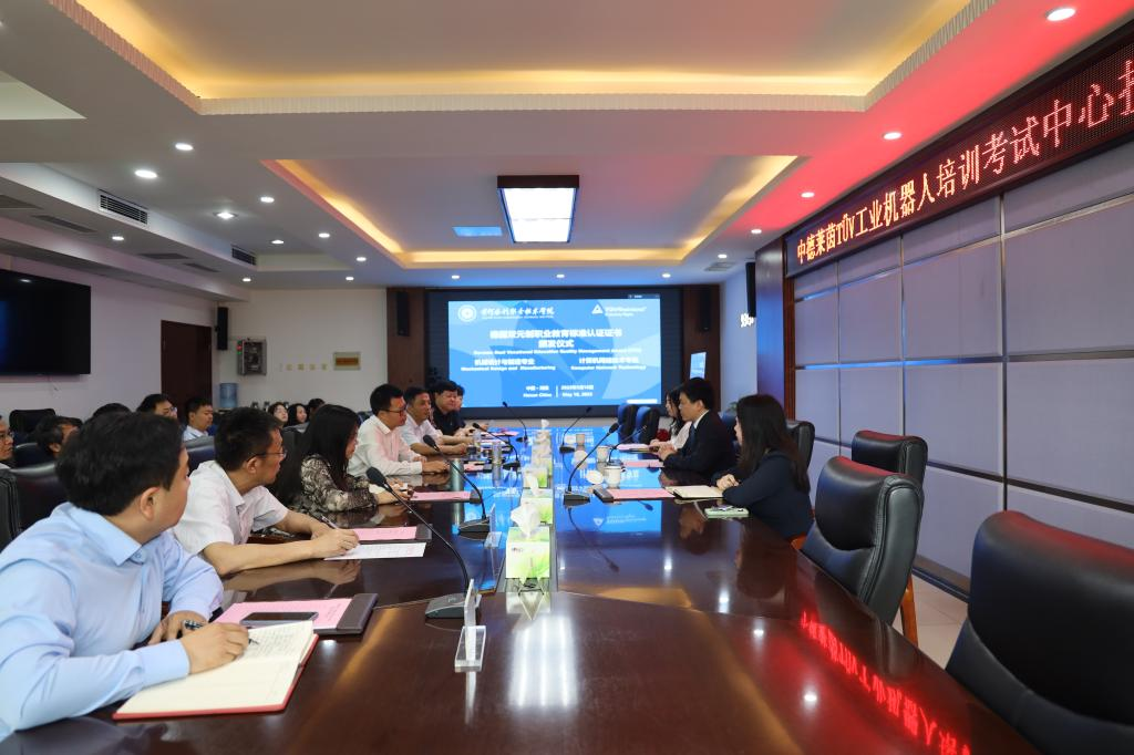 5月18日,中德莱茵TÜV工业机器人培训考试中心授牌仪式在我校举行,标志着华中地区首家德国莱茵TÜV工业机器人培训考试中心正式落户我校。中国教育国际交流协会职业教育与培训部高级项目主管张俊卿,德国TÜV莱茵学院与生命关怀大中华区总经理陈俊东,学校党委副书记、校长胡昊,副校长菅浩然出席会议,教务处、对外联络与合作处、机械工程学院及信息工程学院负责人和教师代表参会。