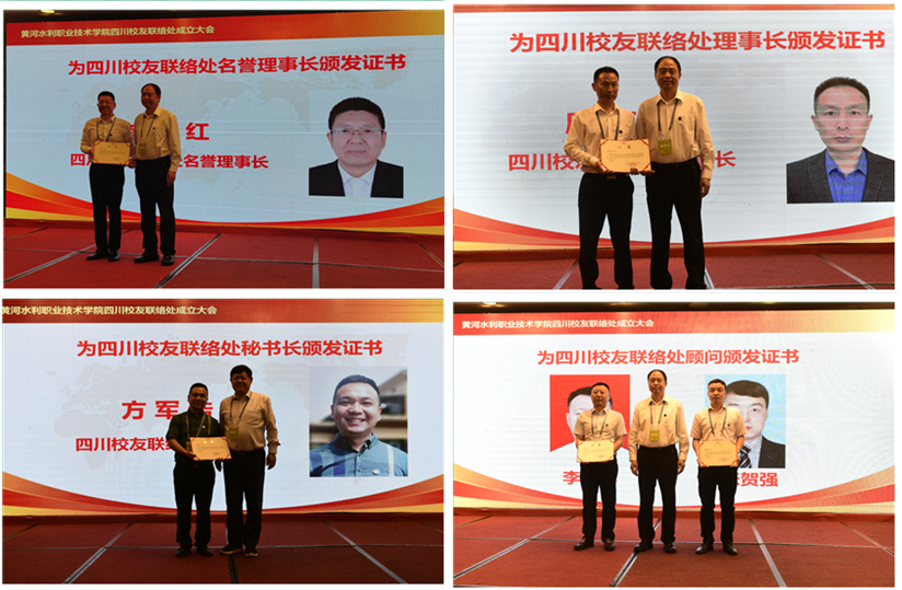 赵国训、崔新红共同为四川校友联络处揭牌。赵国训、王卫东、李纪宾为新当选的首届理事会负责人颁发聘书。