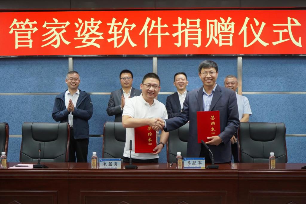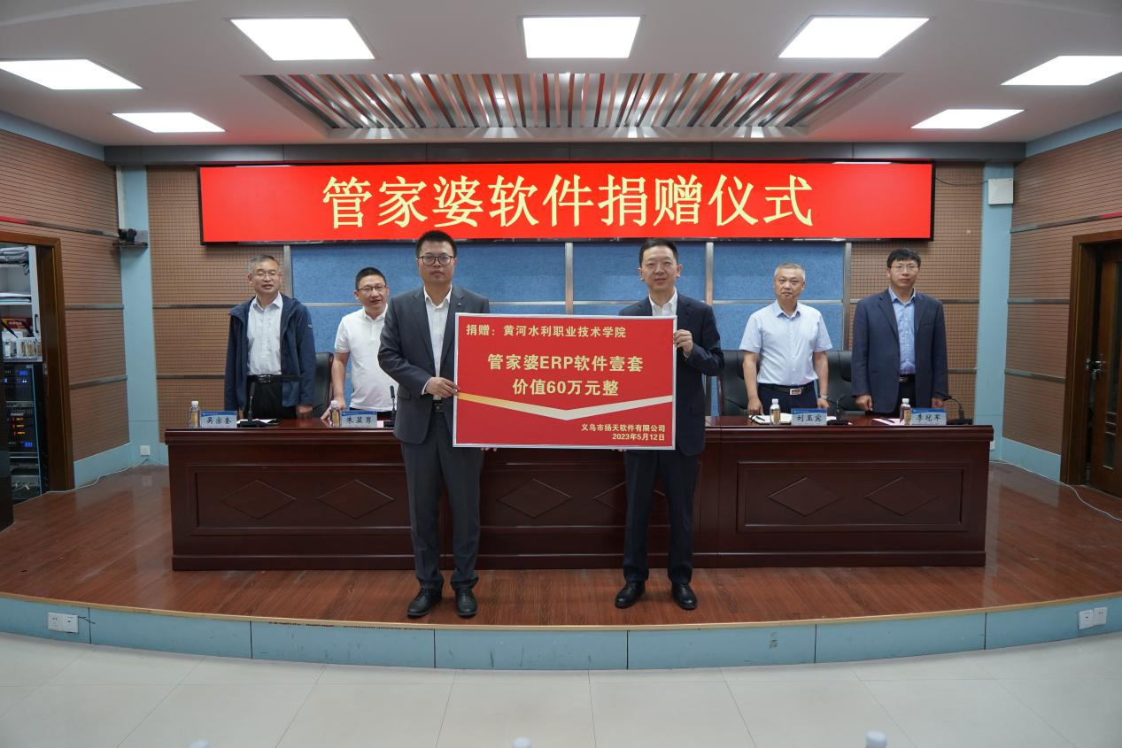 仪式现场,胡昊代表学校接受义乌市扬天软件有限公司向我校捐赠价值60万元的管家婆ERP软件系统;刘玉宾代表学校授予该公司“校企合作单位”牌匾;金融与会计学院院长李冠军代表学校与公司签订了校企合作框架协议。