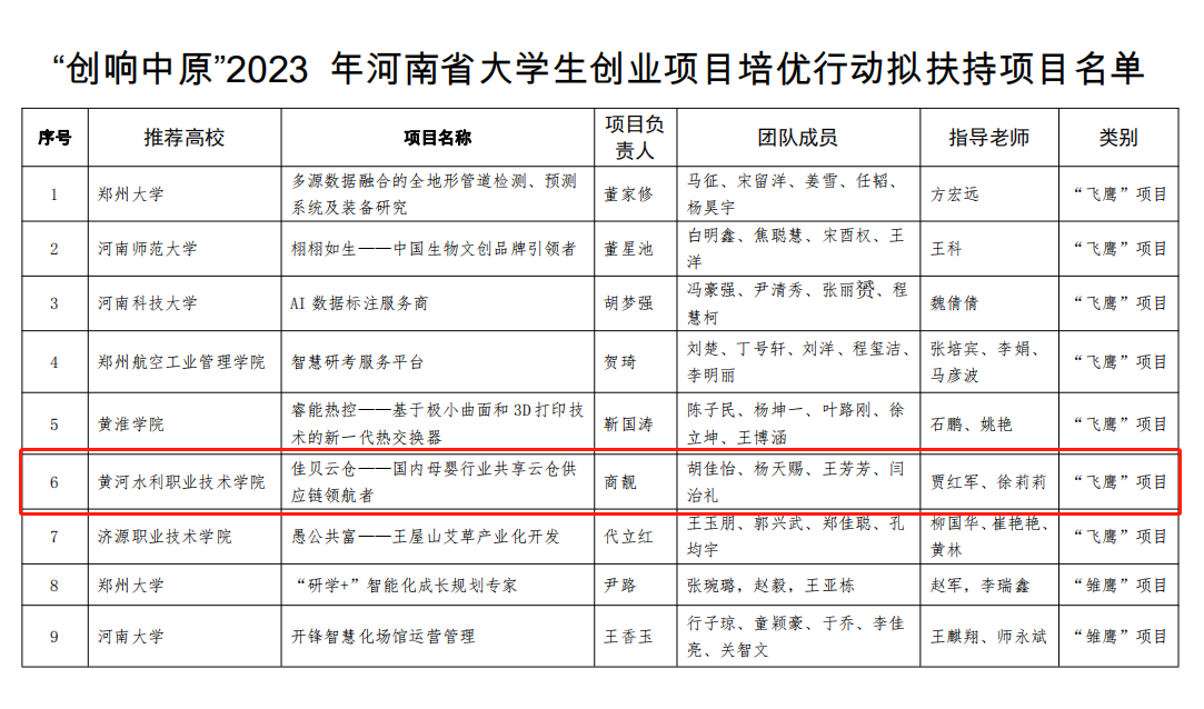 4月26日,“创响中原”2023年河南省大学生创业项目培优行动项目集中路演遴选在河南省大学生就业创业综合服务基地成功举行,我校贾红军、徐莉莉老师指导的大学生创业项目《佳贝云仓——国内母婴行业共享云仓供应链领航者》,获得全省排名第六,高职排名第一,首次荣获“创响中原”2023年河南省大学生创业项目培优“飞鹰”项目。