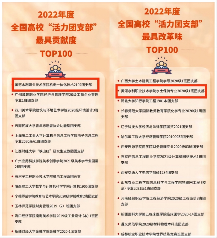 近日,由团中央基层建设部主办、中国青年报社承办的2022年度全国高校“活力团支部”评选活动结果揭晓,经过校内选树、校级展示、省级展示、全国展示等环节,我校水土保持专业2020级1班团支部、机电一体化技术2021级2班团支部分别获得全国高校“活力团支部”最具改革味、最具贡献度100强。