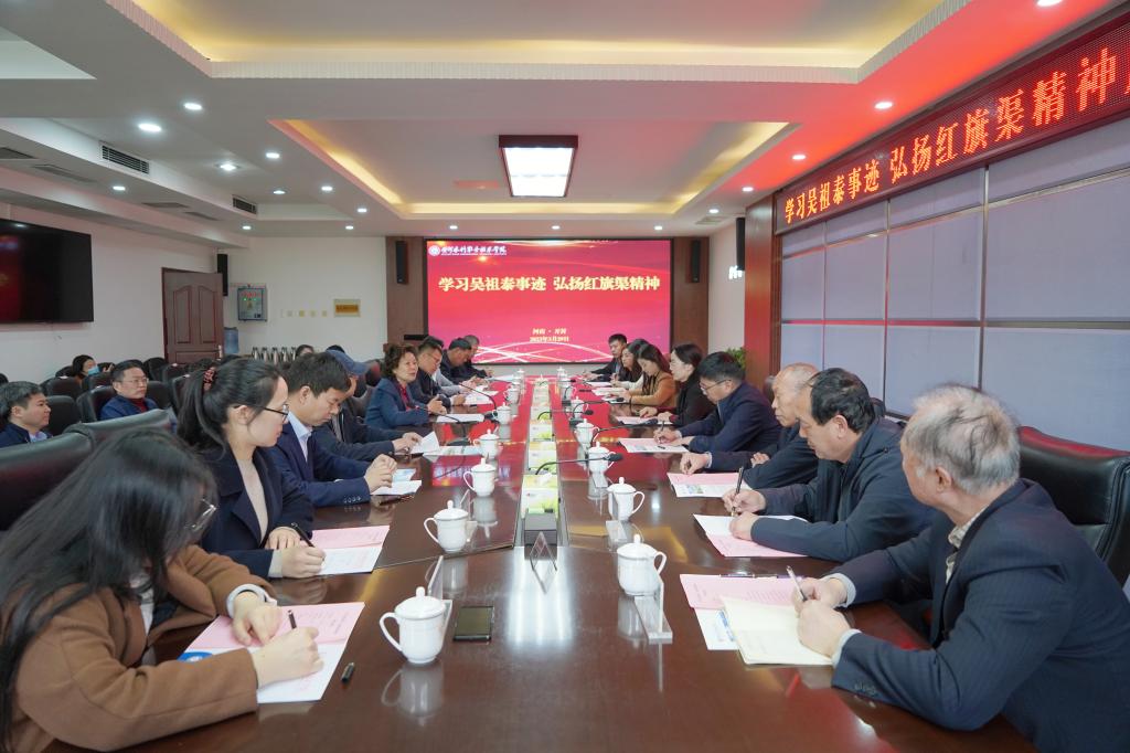 3月29日,我校在行政楼第一会议室召开“学习吴祖泰事迹 弘扬红旗渠精神”座谈会。共青团河南省委副书记王海萍,河南省教育厅思政处处长陈凯,共青团河南省委宣传部长孙冬青,中国青年报社河南记者站站长潘志贤,红旗渠特等劳模张买江,中国戏剧家协会常务理事李云,吴祖泰家属杨根成,原阳县退役军人事务局副局长杜楷、原阳县白庙村党支部书记吴山峰,我校党委书记周保平,党委副书记、校长胡昊,学校师生代表参加座谈。座谈会由党委宣传部部长彭新立主持。