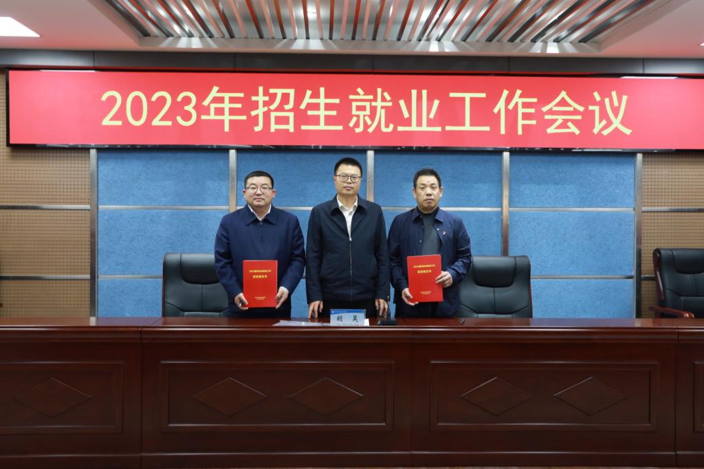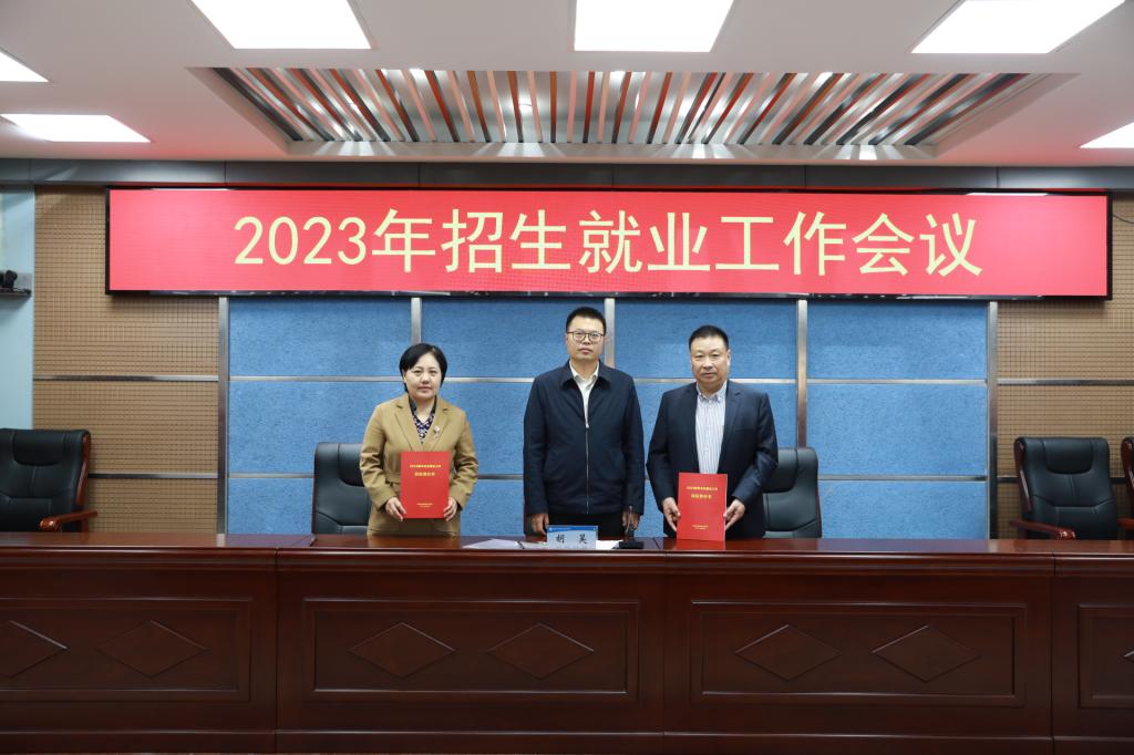 胡昊分别与各学院主要负责人签订《2023届毕业生就业工作目标责任书》并讲话。他充分肯定2022年招生就业工作取得的成绩,指出要充分认识高考改革、职教高考改革和新形势新业态背景下学校招生就业工作所面临的困难和挑战,从人才培养、专业设置的角度充分分析影响学校招生就业工作的深层次问题。他提出三点要求:一是提高站位,正确认识招生工作和就业工作的极端重要性。招生就业工作是学校“双高”建设、“职教本科”建设增值赋能的基础工程和支撑工程,要从讲政治的高度充分认识招生就业工作的重要性,从促民生保稳定的角度理解做好招生就业工作的迫切性,坚持调查研究、顶层设计和系统思考相结合,以高度的责任感和使命感,扎扎实实做好2023年招生就业各项工作。二是拓宽思路,创新机制,认真做好学校招生就业工作。要紧紧围绕“双高”和“职教本科”建设,营造全员、全程、全方位的工作氛围,强化沟通协调、抢抓关键环节、深挖内外资源、创新宣传模式,讲好专业特色,说好学校故事,通过宣传让社会、家长、学生了解学校、认可学校,切实提高生源质量。三是加强领导,落实责任,确保今年学校招生就业工作的顺利进行。要树立毕业生充分高质量就业是检验专业人才培养水平金标准的理念,从压实做细,强化责任落实、全面统筹,拓展就业渠道、提质增效,优化就业服务、示范引领,营造良好氛围四个方面,形成良好的就业工作氛围,构建全员关注就业、全程推进就业、全方位提高就业质量的就业工作生态。他强调,招生和就业工作是一个学校品质的体现,是社会看得见、摸得着的“风向标”,是检验学校办学治校水平、教书育人成果的“试金石”,更是我们职业教育主动适应国家经济社会发展需要、提高高校人才培养质量的重要工作。希望全校上下进一步强化责任意识,靶向引导、精准滴灌,为学校的高质量发展开好局、起好步,以优异成绩助力职本申报和学校“双高”建设。