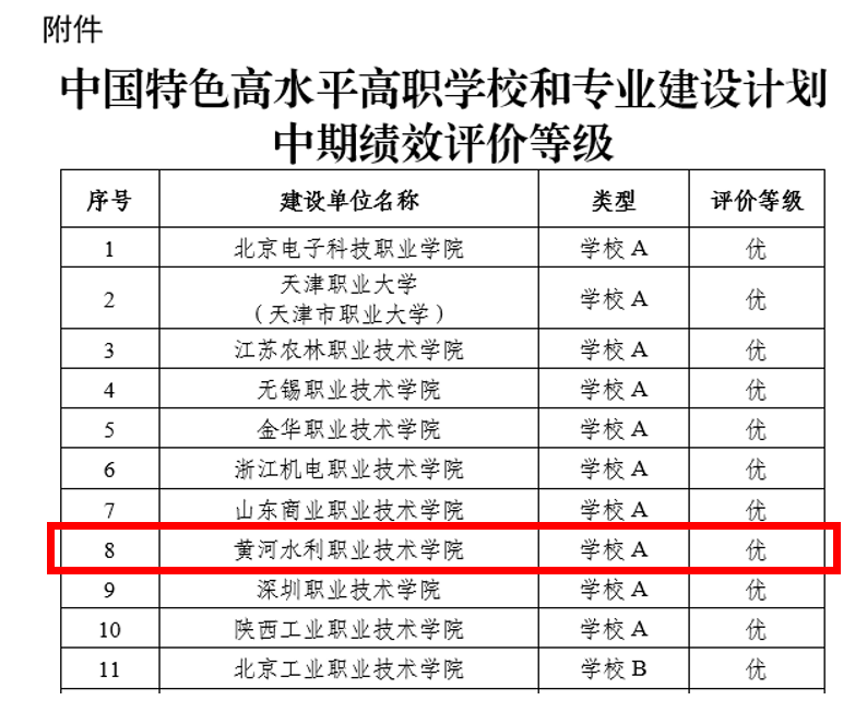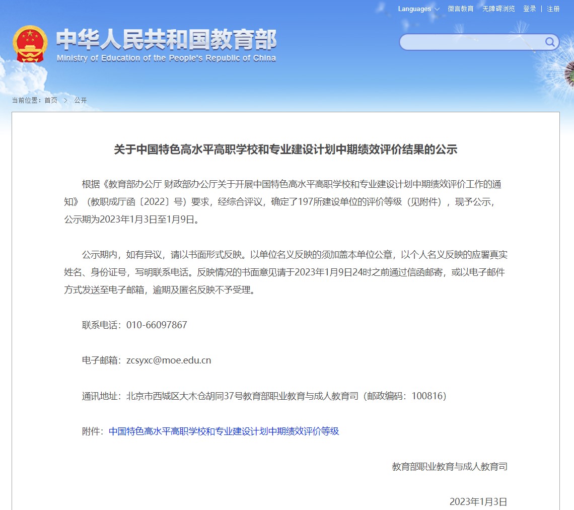 1月3日,教育部职业教育与成人教育司对中国特色高水平高职学校和专业建设计划中期绩效评价结果进行公示,我校获评“优秀”。