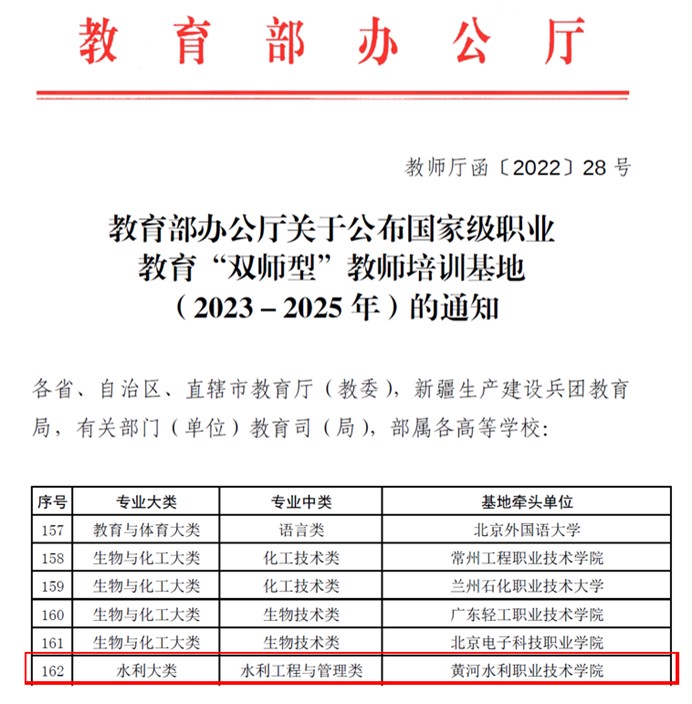 近日,教育部发布了《关于公布国家级职业教育“双师型”教师培训基地(2023-2025年)的通知》(教师厅函〔2022〕28号),我校以水利为优势,在普通本科、职业院校中脱颖而出,成功获批国家级职业教育“双师型”教师培训基地(水利类),全国仅有2所院校获批水利类培训基地。