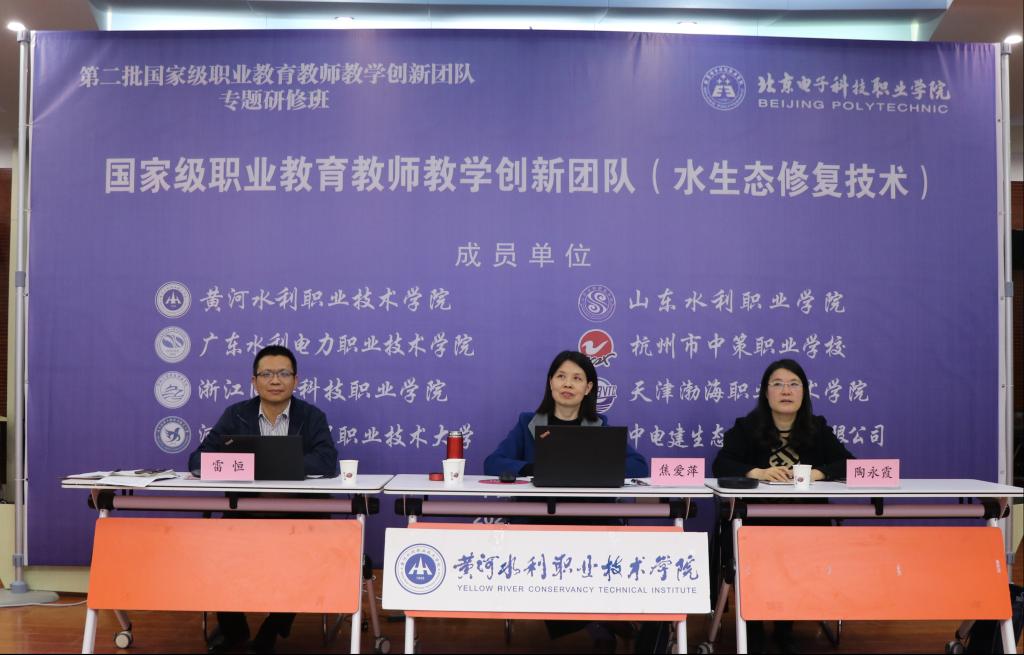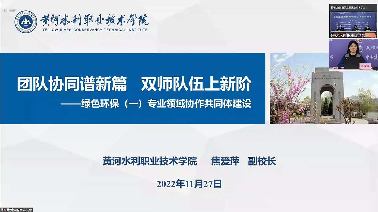 11月27日上午,由教育部教师工作司主办,北京电子科技职业学院承办的第二批国家级职业教育教师教学创新团队专题研修班以线上和线下相结合的方式举行。国家级水生态修复技术专业教师教学创新团队负责人、我校副校长焦爱萍代表国家级绿色环保领域协作共同体牵头单位作题为“团队协同谱新篇,双师队伍上新阶”的专题报告。来自全国24个省市、140所学校等共计1600余人参加了会议,我校教务处、水利工程学院负责人和全体教师及协作共同体成员单位骨干教师线上参加研修学习。