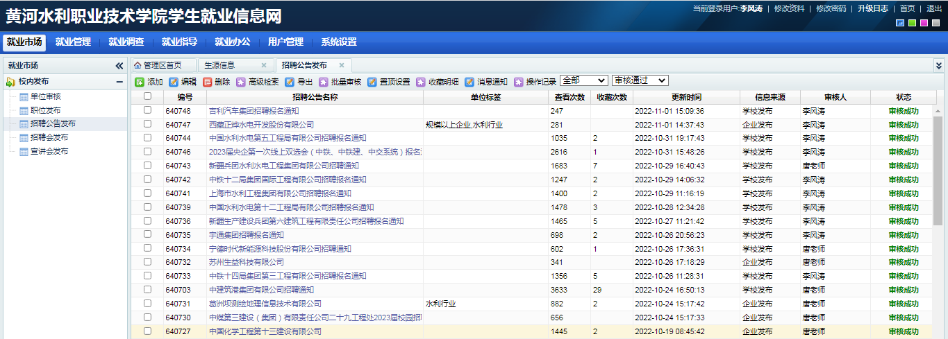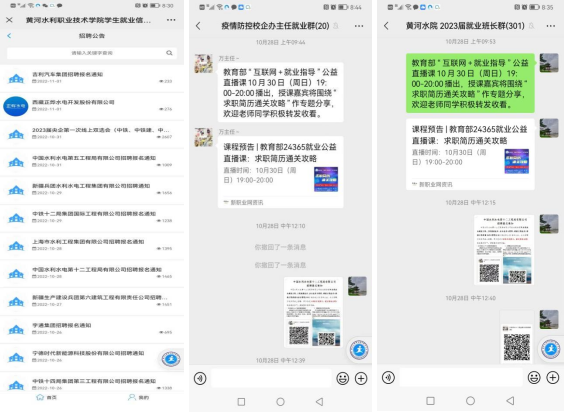 10月24日以来,招生就业服务中心围绕重点行业、重点区域、重点企业,开拓就业市场,派专人通过电话、微信、电子邮件等多种形式,了解中央直属企业、地方企业、校友企业等的人才需求,邀请他们开展线上招聘。通过学校就业信息网、招就微信公众号、毕业班微信群等平台向毕业生精准推送招聘信息,确保就业信息日日更新。截至11月2日,更新就业信息网招聘信息16条,毕业班班长微信群推送招聘信息48条。