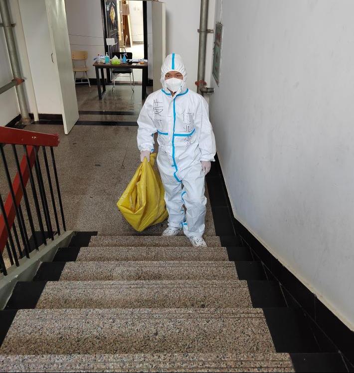 靠着这种必胜的信念,队员们迎难而上,各项工作有序开展。队员们逐步接收安置60余名隔离人员,同时开展分发物资、送餐、清理生活垃圾等工作。他们穿着密不透风的防护服一次次步行穿梭在1楼至6楼之间,汗水浸透了衣服,腿脚已经酸疼,也没有停下服务的脚步。