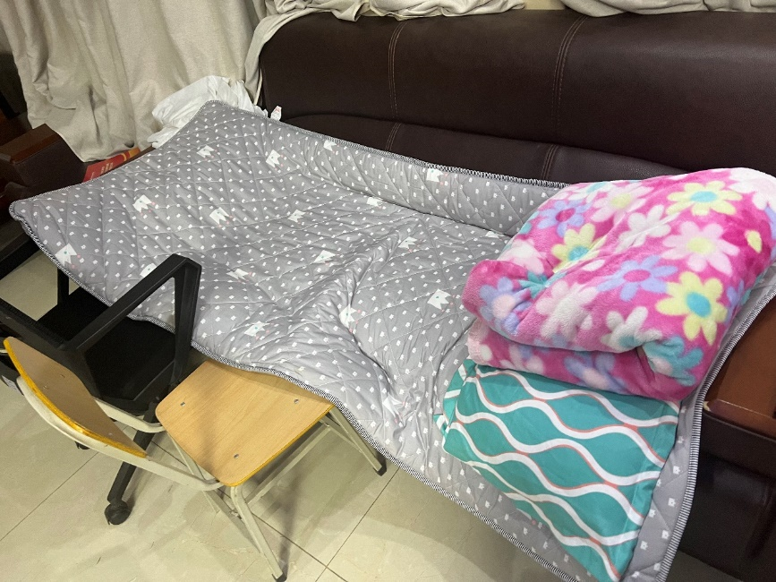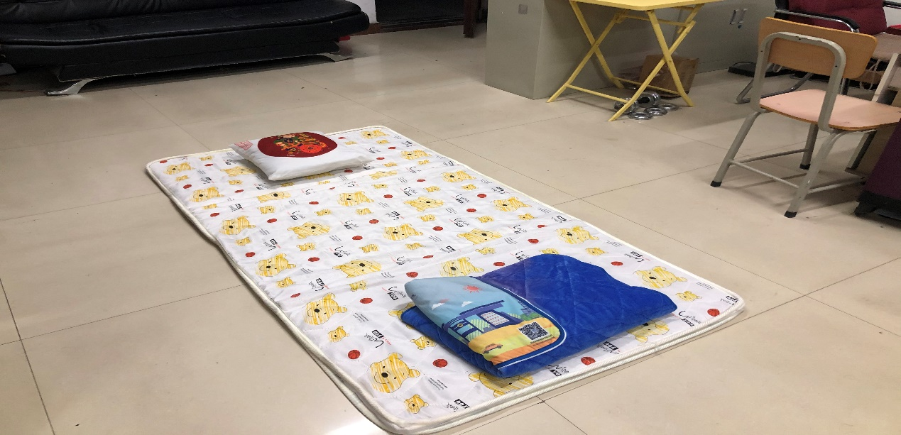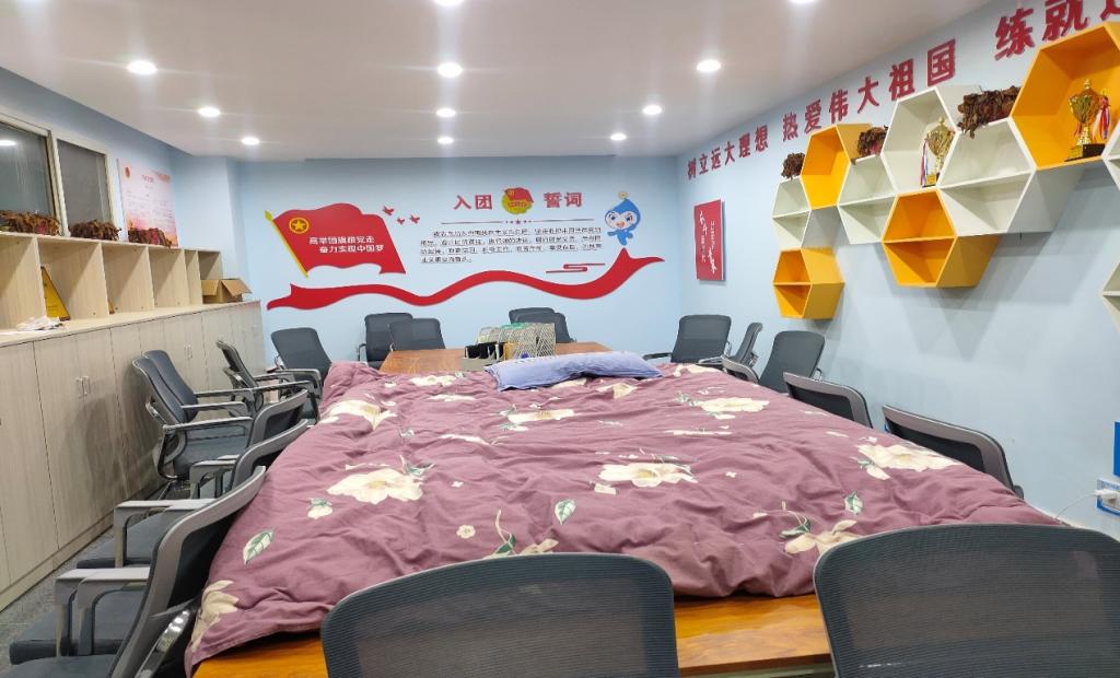 近期,我校周边疫情形势严峻,学校实施临时封控、严格封闭管理。为全力保障全体师生健康及生命安全,确保学校稳定,为学生提供安全环境,我校辅导员教师坚守岗位,吃、住在校,站好为学生服务的每一班岗。在责任面前,他们安抚好孩子,交待好家人,克服了一切困难,义无反顾的坚守在校园,坚守在同学们身边。地铺、行军床、办公室沙发、会议桌都变成了辅导员们的临时床铺。(供图:学生处)