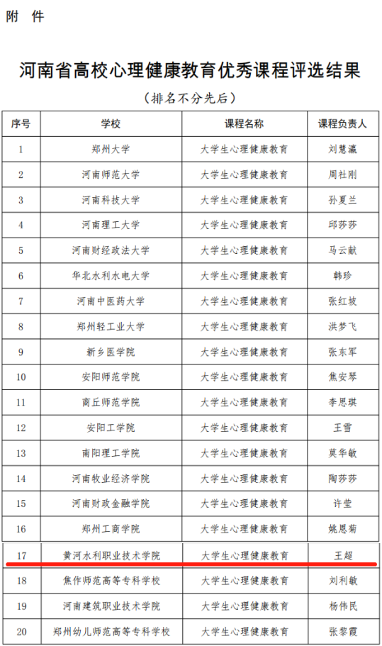 近日,中共河南省委教育工作委员会、河南省教育厅印发《关于公布全省高校心理健康教育优秀课程评选结果的通知》(豫教工委〔2022〕116号),全省共评选出20门优秀《大学生心理健康教育》课程,其中本科院校16门、高职院校4门,我校王超老师负责的《大学生心理健康教育》课程位列其中。